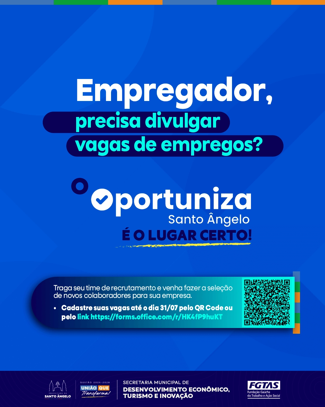 Empresas interessadas em recrutar profissionais têm até o dia 31 de julho para cadastrar suas vagas no Oportuniza Santo Ângelo – uma grande ação voltada à geração de emprego, qualificação profissional e oferta de serviços gratuitos à comunidade. As vagas podem ser cadastradas através deste link.